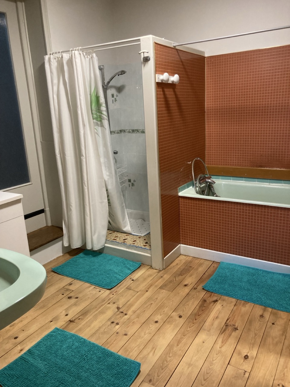 - Grande salle de bains avec lavabo, baignoire et douche.
