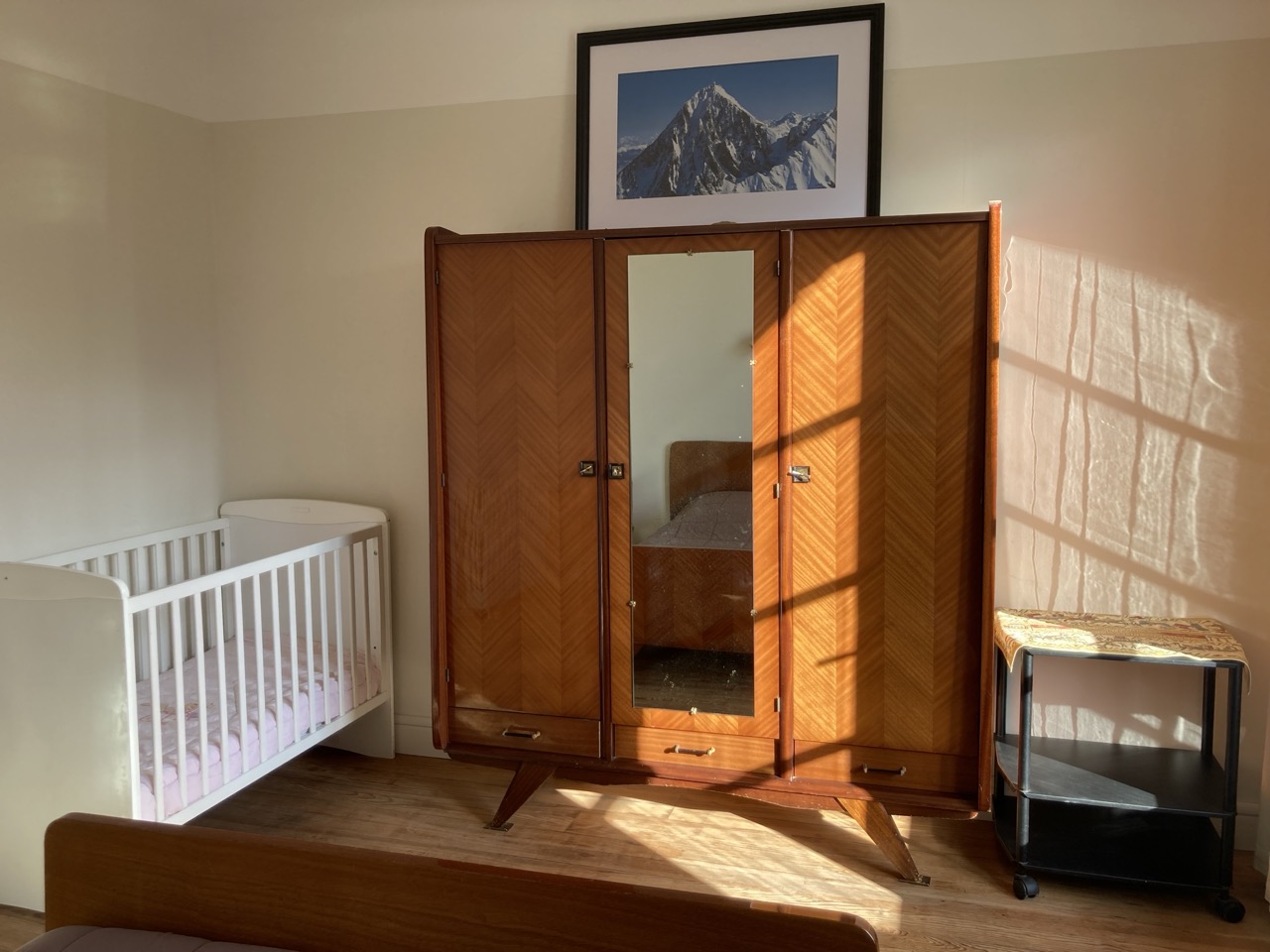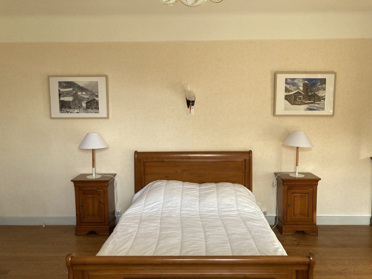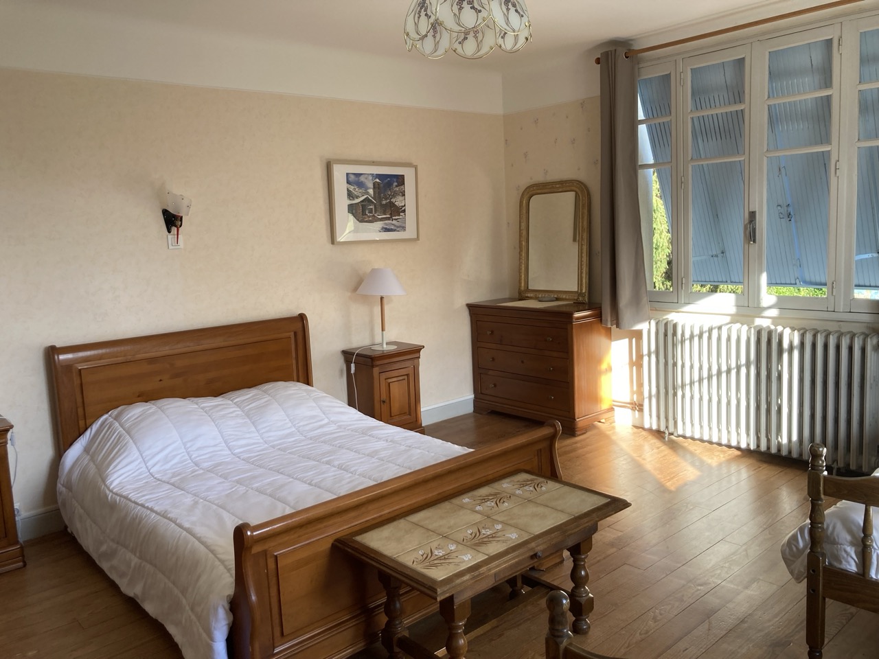 - Chambre 3 « Pyrénées » (15 m²) – exposition Sud : 1 lit 2 pers en 140. 1 lit bébé bois, armoire penderie, commode.